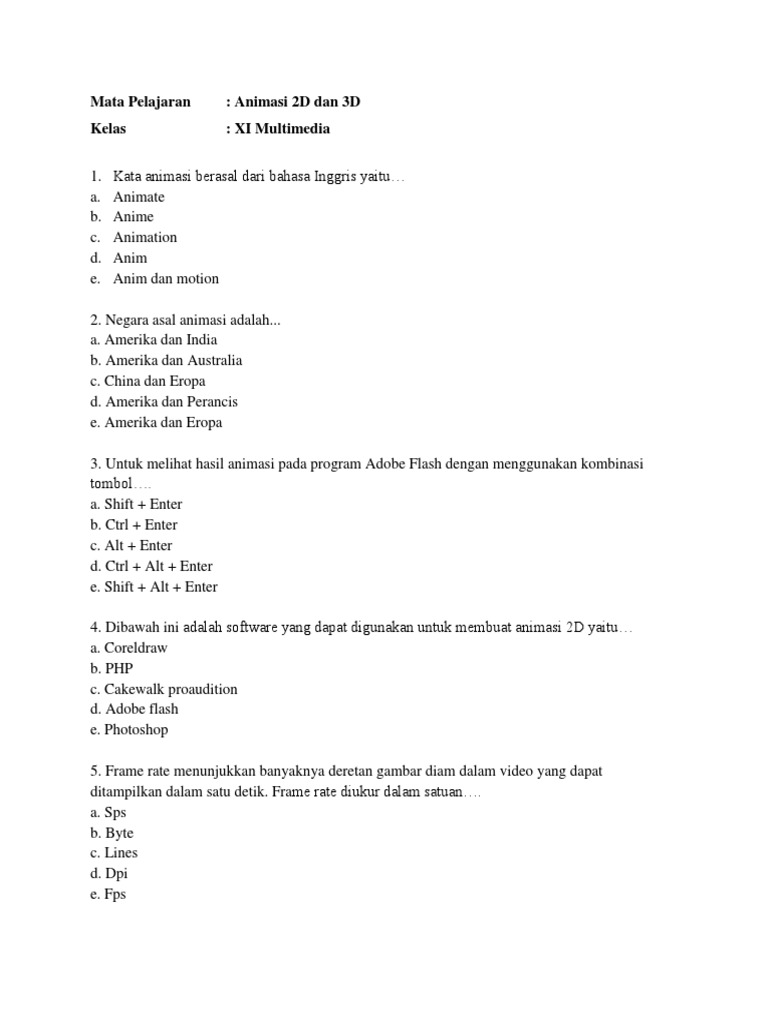 2 dimensi menggunakan teknik tweening, mengevaluasi peranan karakter dalam sebuah karya animasi, merancang produk animasi 2 dimensi dapat memahami konsep dasar obyek 3d, dapat memahami interface aplikasi pemodelan 3d, dapat memahami fitur viewport shading, dapat. Gomunime adalah website nonton anime subtitle indonesia gratis disini bisa download dengan mudah dan streaming dengan kualitas terbaik. Pada kesempatan ini, soal meminta kita untuk menyajikan contoh animasi dua dimensi dan tiga dimensi. Soal mm animasi 2 d dan 3 d. Soal teknik animasi 2d dan 3d uas ganjil by nuzal4fandra. Prinsip animasi yang memberikan kekenyalan dan kelenturan pada objek dianimasikan disebut … answer choices. Soal dan jawaban animasi 2 dimensi dan 3 dimensi pada bab bab pengenalan aplikasi animasi 2d adobe flash. Untuk melakukan tes kemampuan kalian silakan tekan tombol di bawah ini. Soal multimedia animasi 2d dan 3d. Doraemon, scooby doo, looney tunes merupakan jenis animasi yang tergolong…. Jepang sudah banyak memproduksi anime. Dengan animasi 3d, karakter yang diperlihatkan semakin hidup dan nyata, mendekati wujud manusia aslinya. Soal animasi 2d + jawaban.